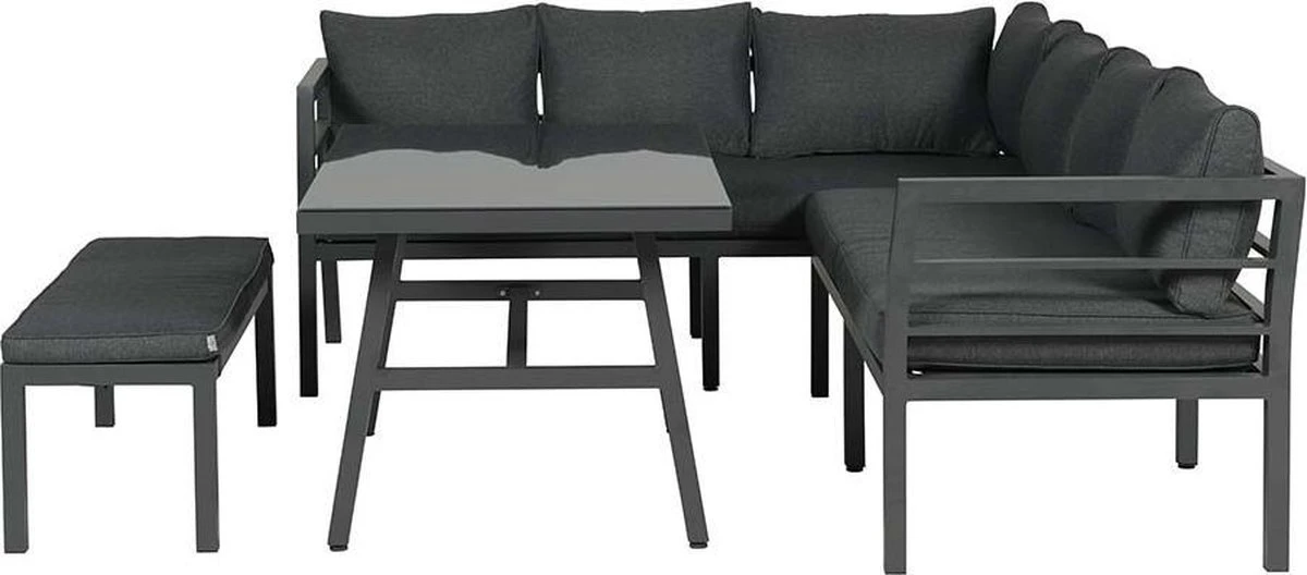 De afmeting van de setopstelling is L 195 x B 245 x H 73 cm, de sportbank: L 120 x B 40 x H 36 cm en de lounge tafel: L 135 x B 80 x H 68 cm. Volledig gemaakt van aluminium met een poedercoat in de kleur carbon black met donker grijze kussens.