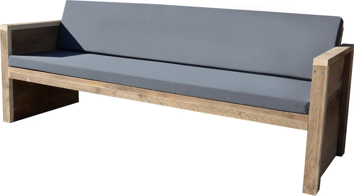Super leuk tuinbankje voor in je tuin of op je balkon. Deze steigerhouten bank heeft een buitenmaat van 175 cm breed, een totale hoogte van 72cm en een diepte van 57cm. Je hebt een zitoppervlakte van 43cm diep en een zithoogte van 38cm exclusief kussen en 43cm inclusief kussen. Kussenset is water- & vuilafstotend uitgevoerd in de kleur antraciet, de kussens zijn 5cm dik koud schuim. Dit zorgt voor een comfortabele zachte zit.
